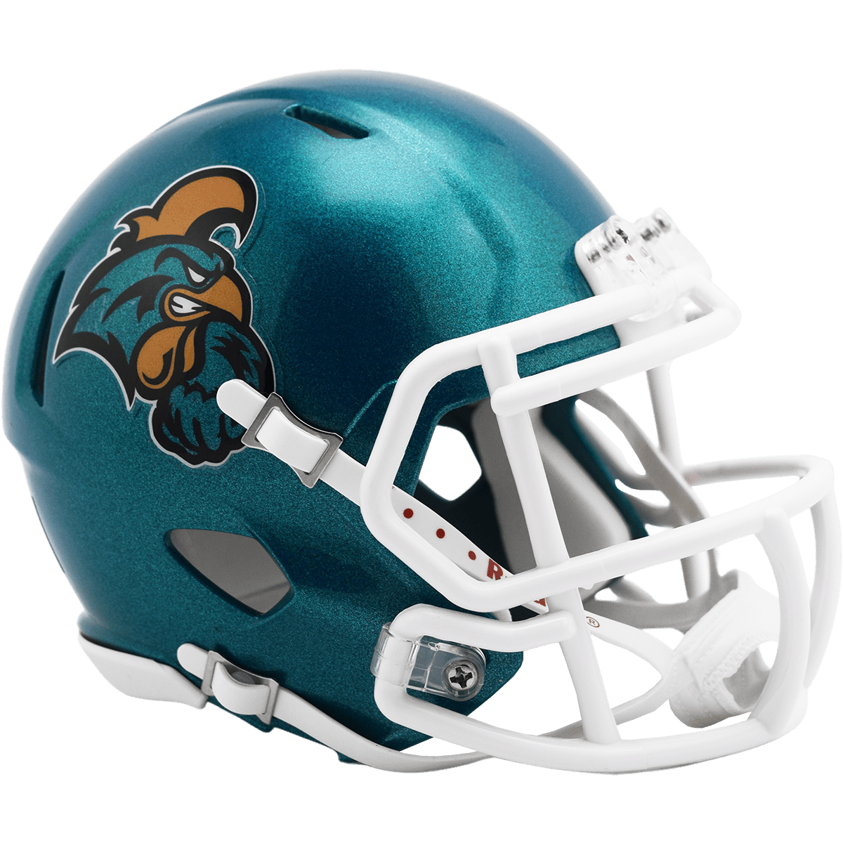 Based on one of the most popular on-field designs, this collectible Speed Mini football helmet is made specifically for fans of the Coastal Carolina Chanticleers. At approx. 5.5 in. tall, this half-scale display helmet is perfect for all football fans and great for autographs. The helmet features a mini size Speed shell, the S2BD-SW-SP face mask, a 4-point chinstrap, and official paint and decals. The perfect collectible or gift! SKU: 8058816