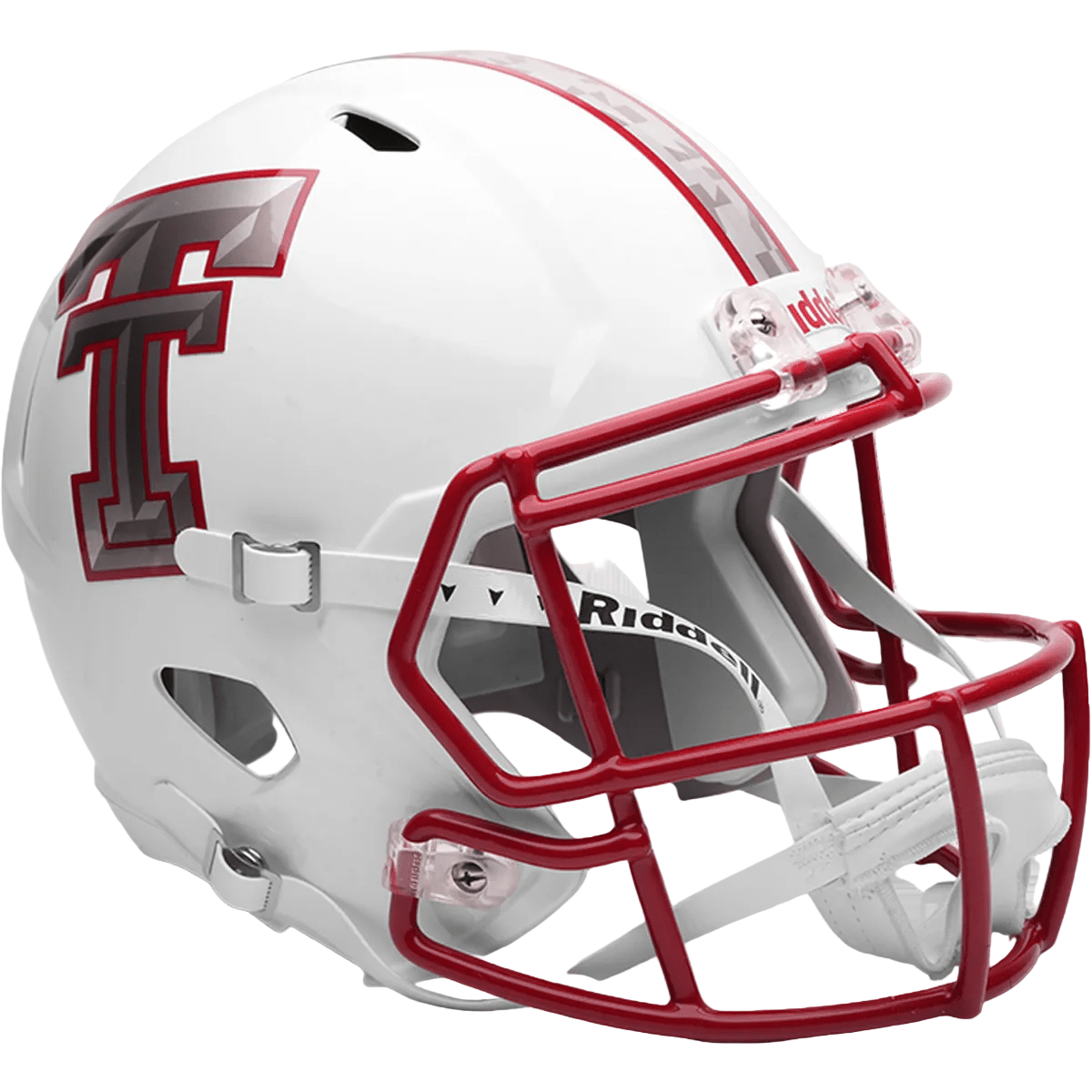 Based on one of the most popular on-field designs, this collectible Replica Speed football helmet is made specifically for fans of the Texas Tech Red Raiders. At approx. 9.5 in. tall, this replica size display helmet is perfect for all football fans and great for autographs. The helmet features a medium size Speed shell, the S2BD-SW-SP face mask, a 4-point chinstrap, and official paint and decals. It also includes a non-wear plate and molded foam jaw pads. It is not to be used for play. The perfect collectible or gift! SKU: 8060533