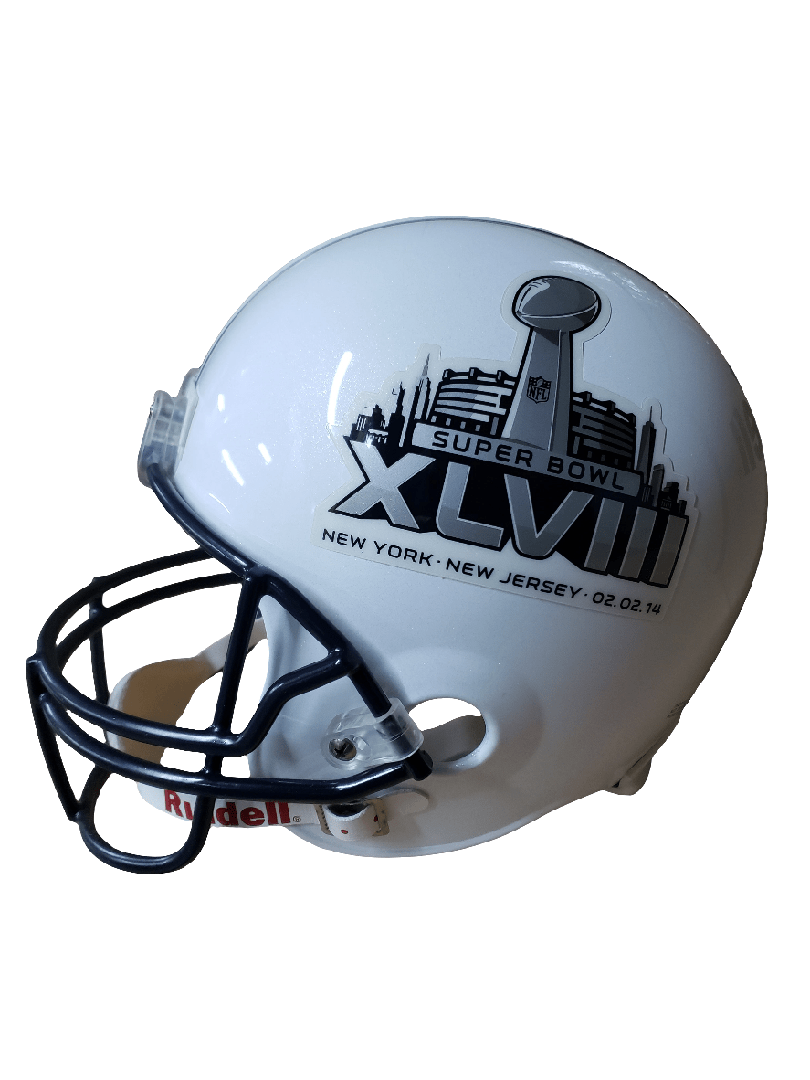Based on one of the most popular on-field designs, this collectible VSR4 Replica football helmet is made specifically for fans of the Super Bowl. At approx. 9.5 in. tall, this replica size display helmet is perfect for all football fans and great for autographs. The helmet features a medium size Speed shell, the S2BD-SW-SP face mask, a 4-point chinstrap, and official paint and decals. It also includes a non-wear plate and molded foam jaw pads. It is not to be used for play. The perfect collectible or gift! SKU: 8005938
